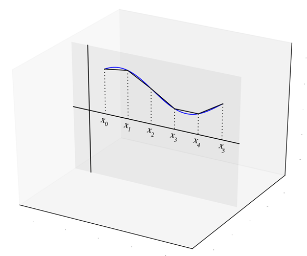 et approximons le graphe par la ligne brisée qui passe par les points $(x_i, f(x_i))$ (figure 4). La surface de révolution engendrée par le graphe (figure 5) sera d'autant mieux approximée par celle engendrée par